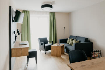 Unsere modernen Ferienwohnungen (39-40m²) mit Küche, Wohnzimmer, Schlafzimmer, Bad mit großzügiger Dusche und Balkon bietet dir Komfort für die schönsten Tage im Jahr.