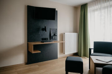 Entspanne dich auf dem gemütlichen Sofa (mit Bettfunktion). Das helle Wohnzimmer verfügt über einen Esstisch, Schreibtisch, einen modernen Flat-TV, WLAN und eine stilvolle Einrichtung, um deinen Aufenthalt zu einem komfortablen und angenehmen Erlebnis zu machen.