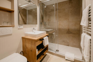 Das hochwertig ausgestattete Badezimmer mit WC verfügt über eine große, begehbare Dusche, Handtücher und Föhn.